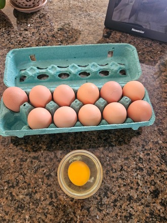 Happy chickens produce delicious eggs. My hens are happy and healthy members of my family. I have 8 hens and 2 roosters who free range a minimum of 3 hours daily.